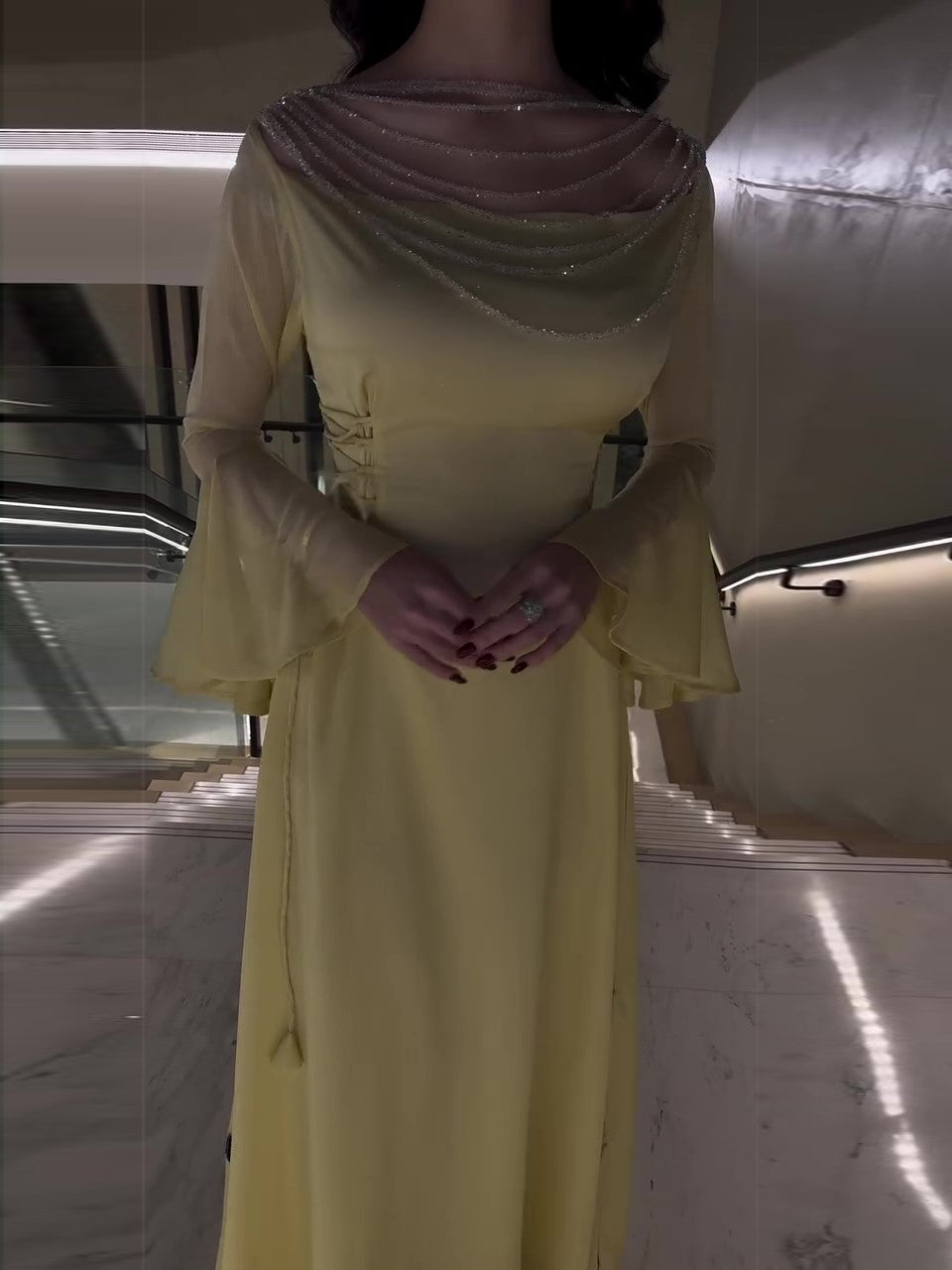 Yellow Pleated Belted Ruffled Sleeves Maxi Dress
